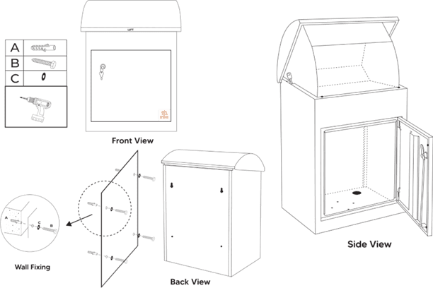 • Always take care when handling power tools or drilling into brick, stone, or concrete. Any accidental damage to your property or the Parcel2U Box during installation is not covered by the manufacturer or retailer.